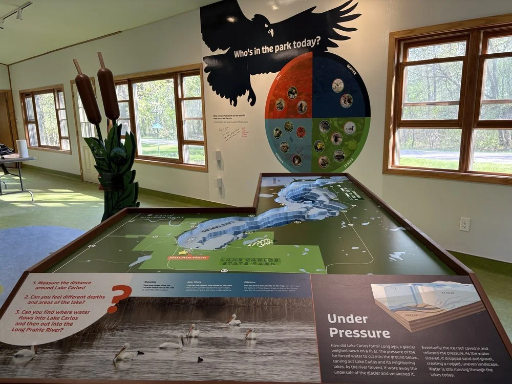 Evergreen Creative fabricated and installed a full interior exhibit redesign at the Lake Carlos State Park Visitor Center in Alexandria, MN. Working under the direction of interpretive planners and designers at 106 Group—who were contracted by the Minnesota Department of Natural Resources—we transformed the space into a hands-on educational experience centered around lake science, regional wildlife, and glacial geology.