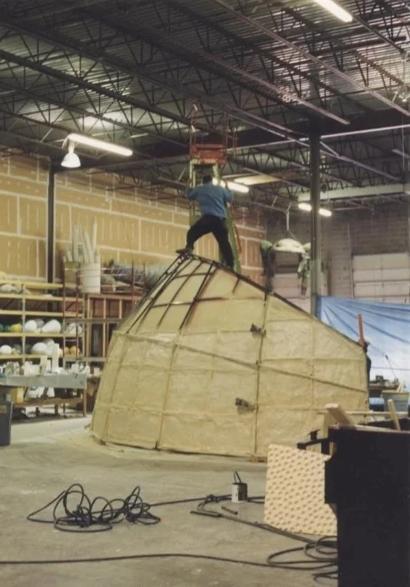 This was “an impossible build”, according to more than a few skeptics. Knoxville’s climate demanded engineering that could withstand both hurricane-force winds and winter snow loads, and the basketball’s base had to match the curvature of the building’s dome perfectly. We recreated a replica of the rooftop in our shop to shape the base precisely, then fabricated the massive sphere in sections, delivering it across three full truckloads. The scale was jaw-dropping, the skins were enormous, and the installation was even broadcast live on ESPN (adding another layer of coordination as our team managed media presence alongside a tightly orchestrated rigging plan.)